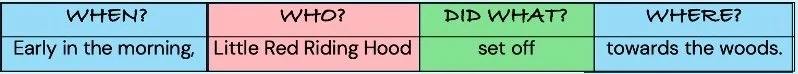Students are taught to identify the key ‘chunks of meaning’ in the sentence by asking probe questions (and colour-coding the various elements). Gradually, terms are introduced that indicate the function of each chunk. By starting with meaning rather than abstract technical terms, we engage students with relevant accessible understandings about language.
