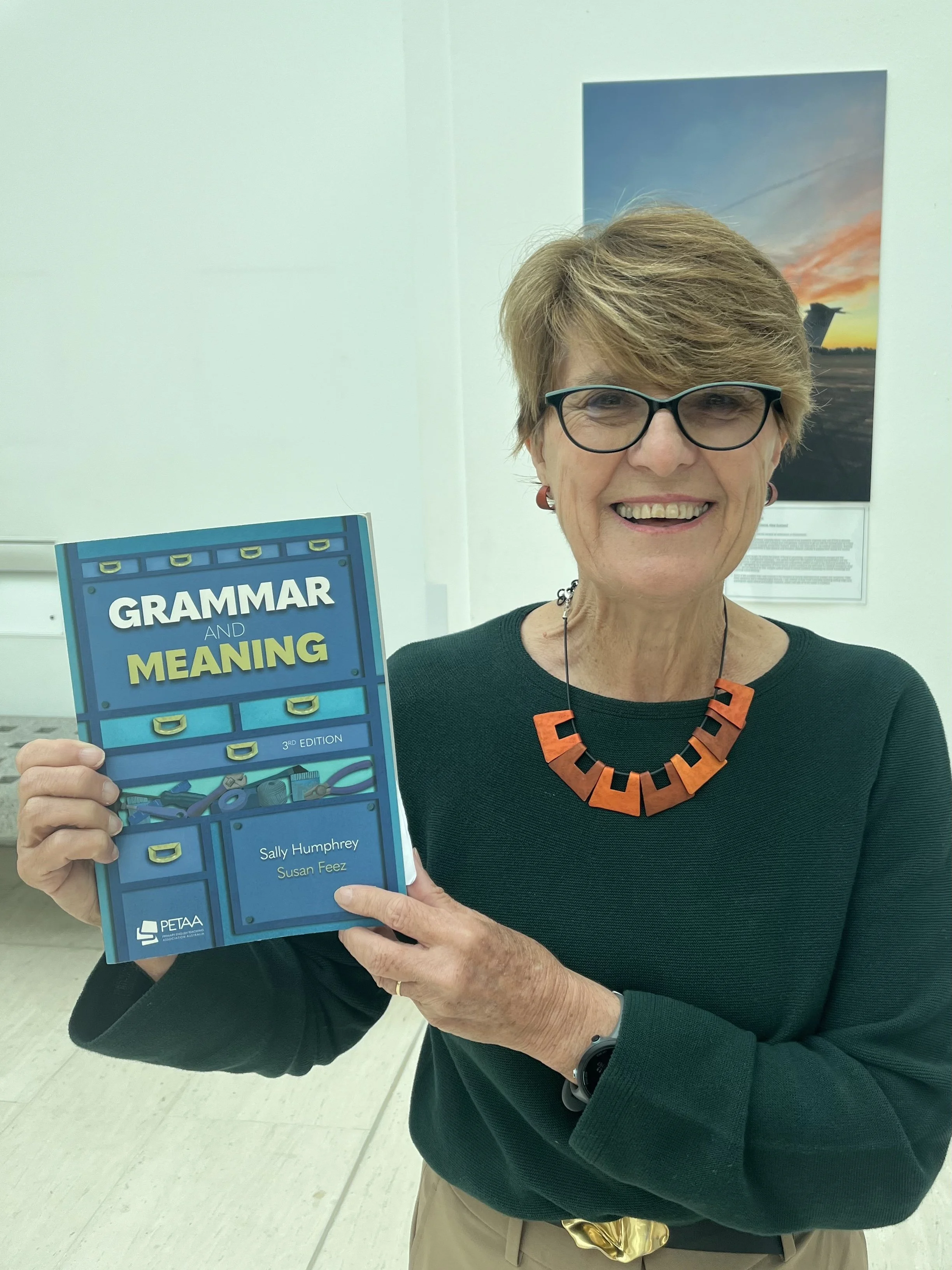 Sally Humphrey with the 3rd edition of Grammar and Meaning. Available from petaa.edu.au